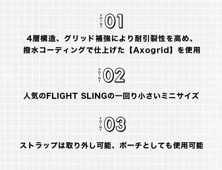 人気のFLIGHT SLINGの一回り小さいバージョンが新登場。 軽量で収納便利な旅の必需品を仕分けできるポータブルなスリングバッグになります。