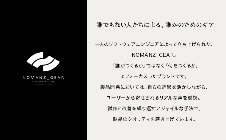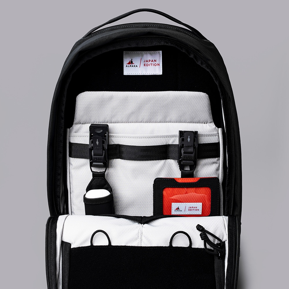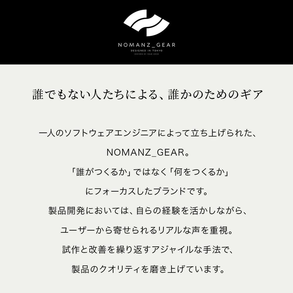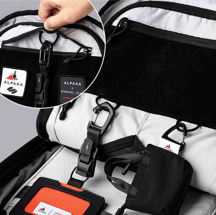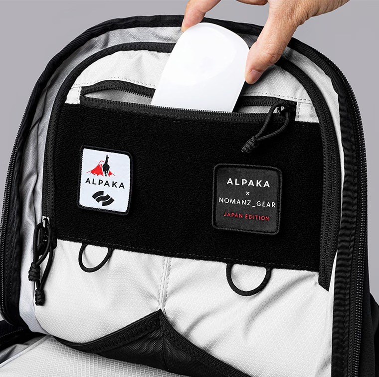 NOMANZ_GEARとALPAKAのオリジナルパッチ2枚付属。 前面収納:パッチ装着用の面ファスナーを配置。付属の限定コラボパッチや別売りのパッチで、内部までアレンジを楽しめます。面ファスナーの上部には小物収納に便利なファスナーポケットを装備。