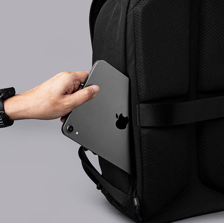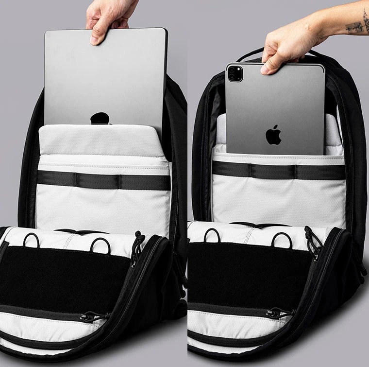 背面収納:パッド入りの16インチ対応のパソコンスリーブと11インチ対応のタブレットスリーブを完備。