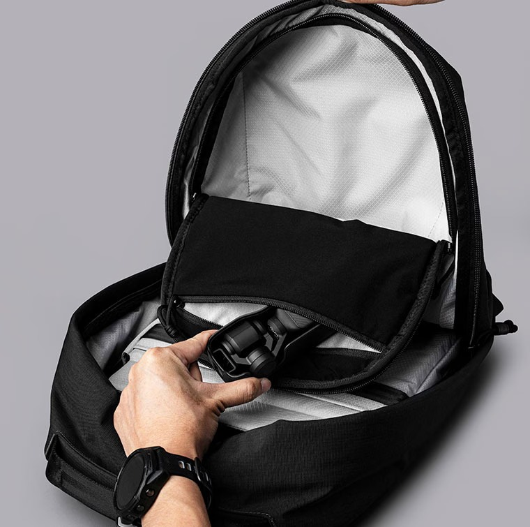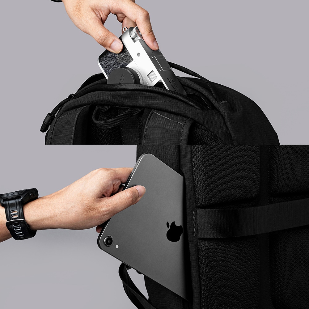 上部にはスマホやカメラを優しく守るフリース裏地のクイックファスナーポケット搭載。