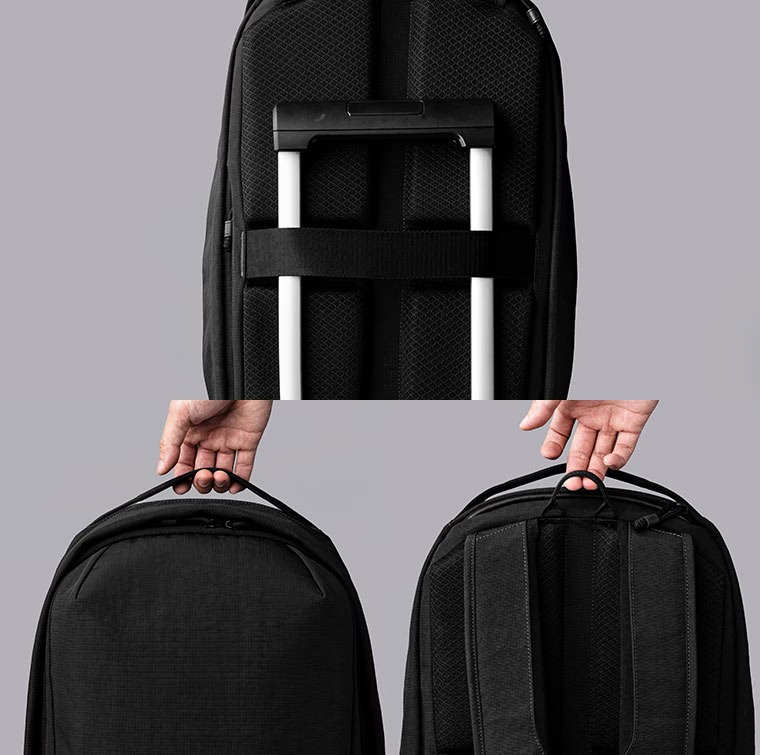 出張に便利なキャリーハンドル用ベルトに加え、手持ち用ハンドルと、フックに掛けるための専用ループをそれぞれ独立して配置。