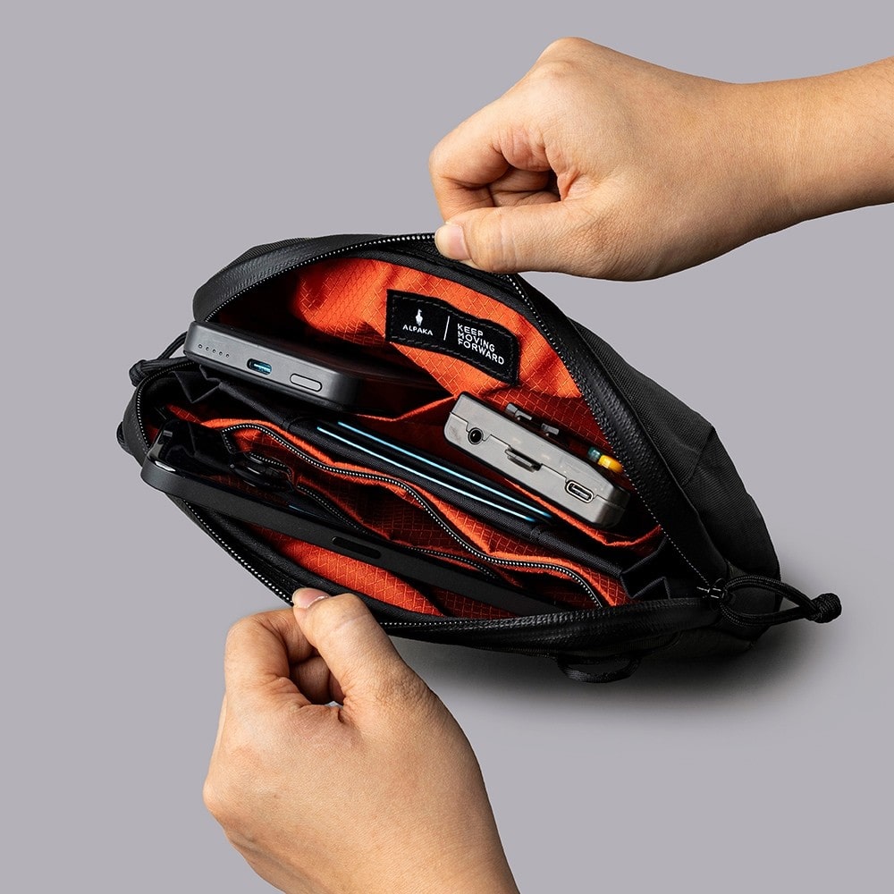 メインコンパートメントにはファスナーポケット、オープンポケットを装備。