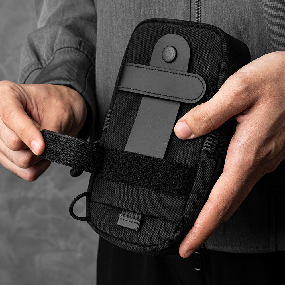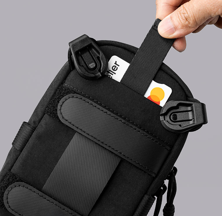 ストラップを取り外し、ベルトを通してウエストに装着、またはバックパックなどに付属のループに取り付けて使用することもできます。