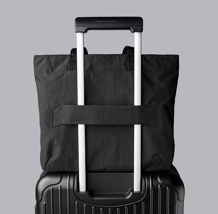 背面にはキャリーケース用ベルト付きで旅先や出張先でもスーツケースに取付可能。