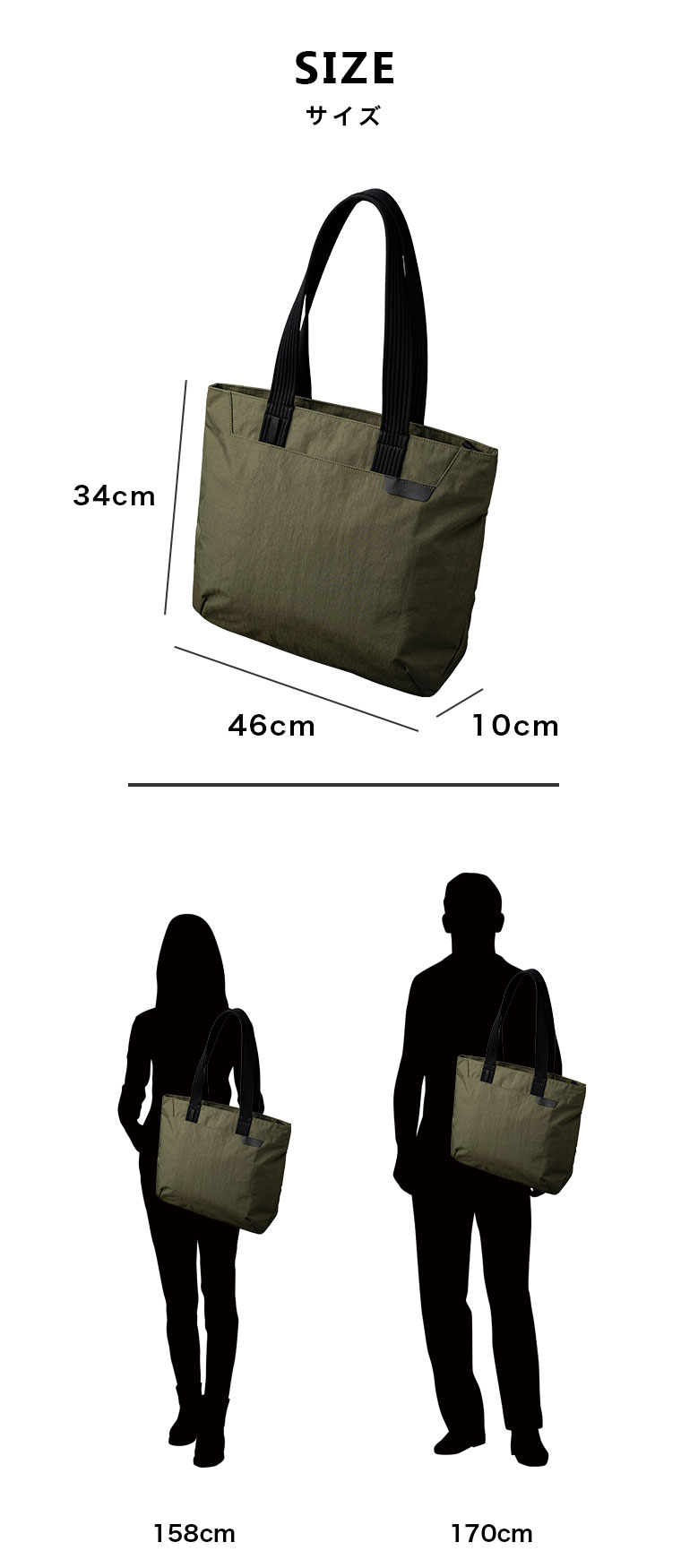 サイズ (約)[本体]タテ34cm×ヨコ46cm×マチ10cm、[ショルダー長さ]60cm