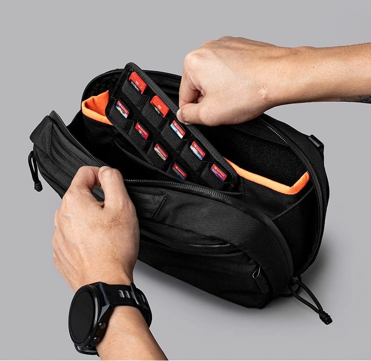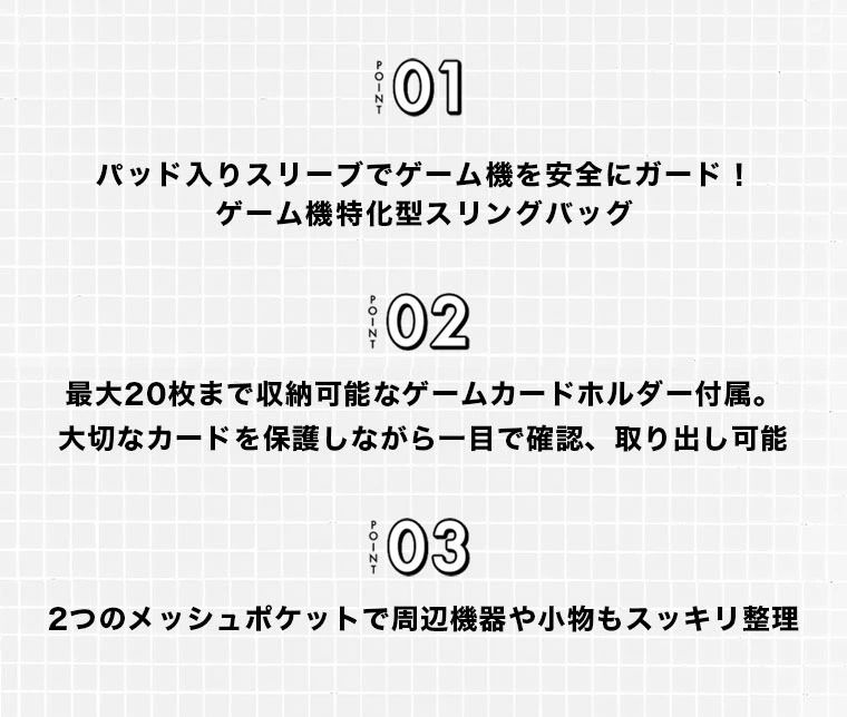 メインコンパートメント:ゲーム機用スリーブx1、メッシュオープンポケットx2、 ゲームカードホルダー用スリーブx1、 ゲームカードホルダー(最大20枚まで収納可能)x1