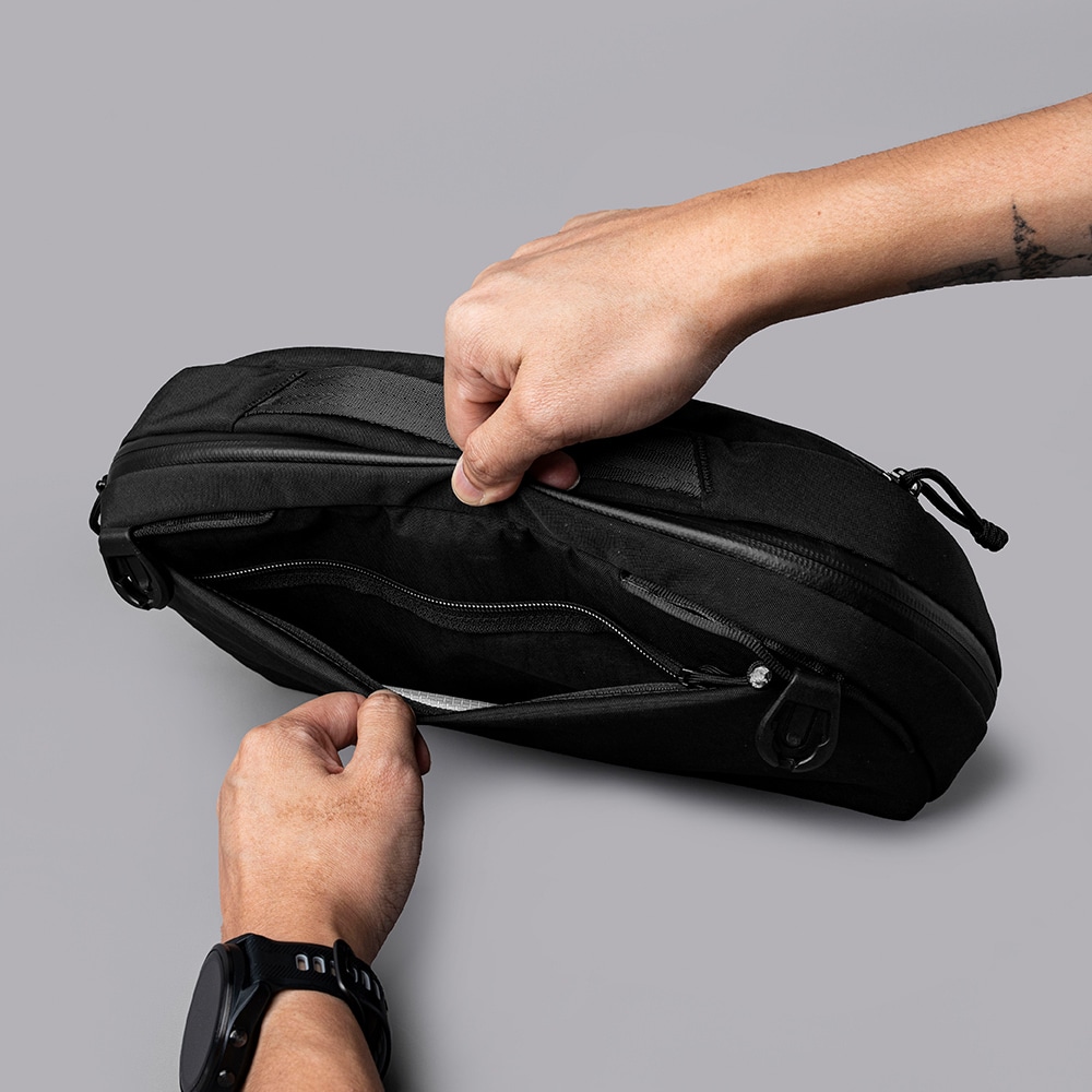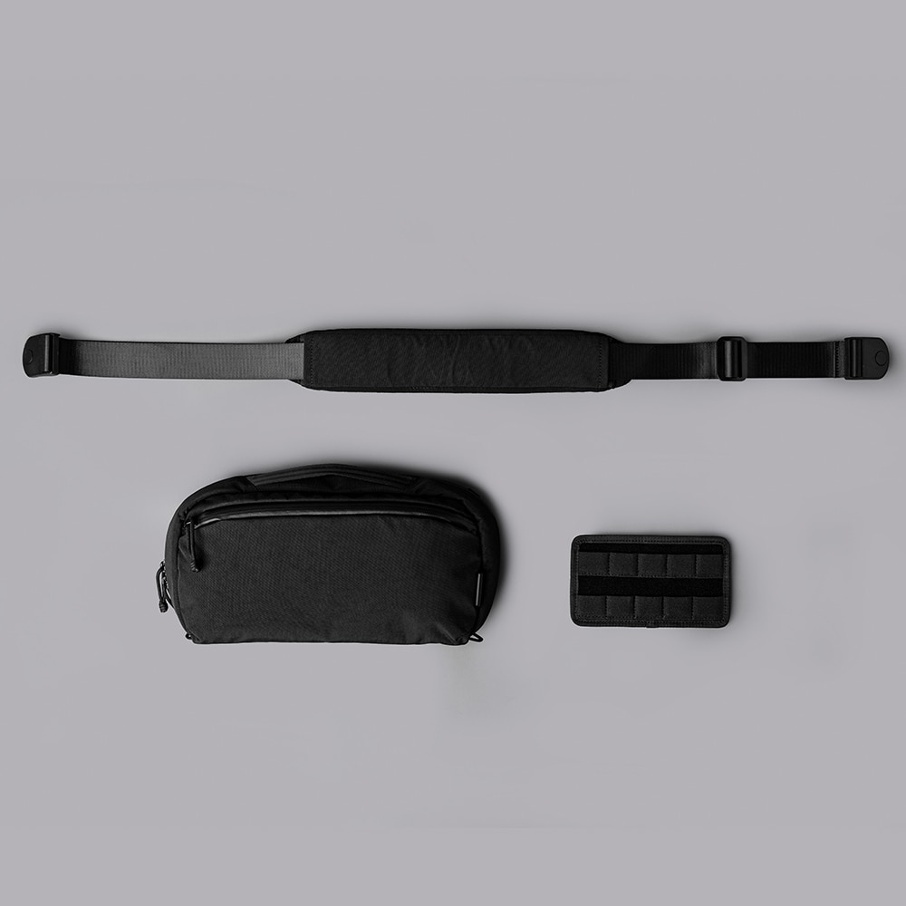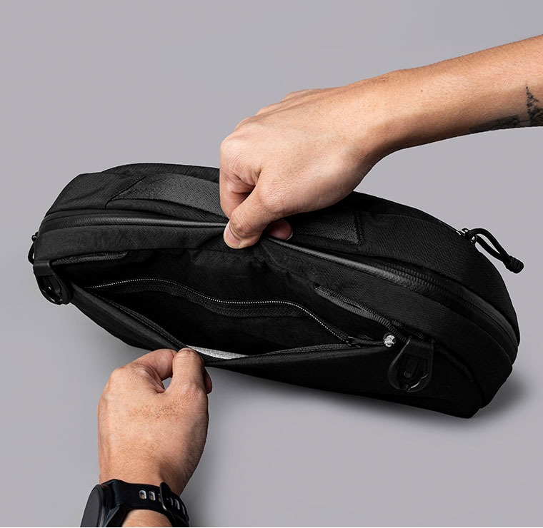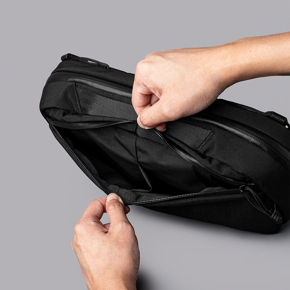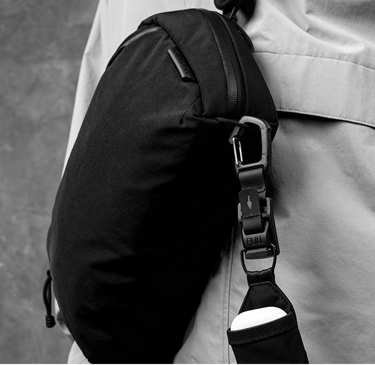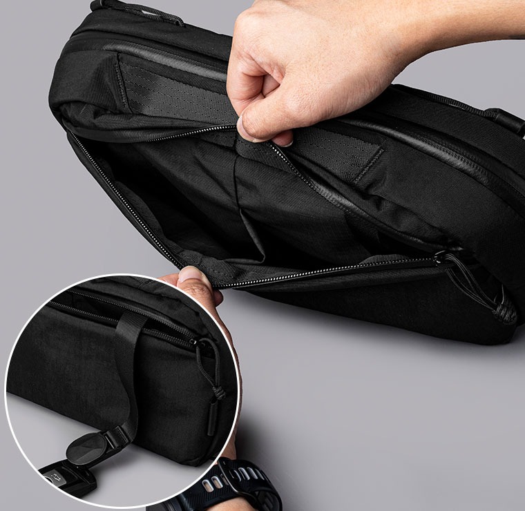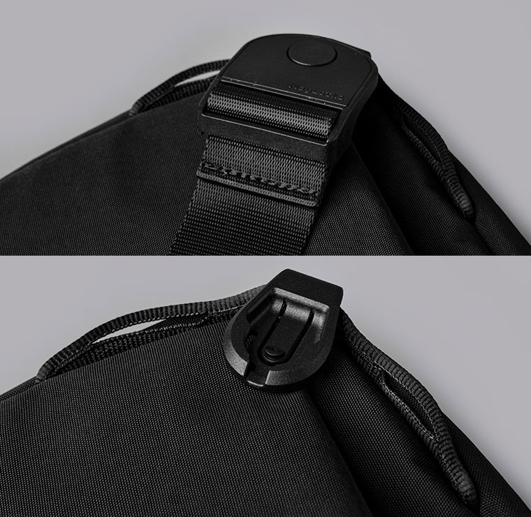 取り外し可能なパッド付ショルダーストラップは、サイドに備わった3つずつのループにより、好みの位置に付け替えられます。