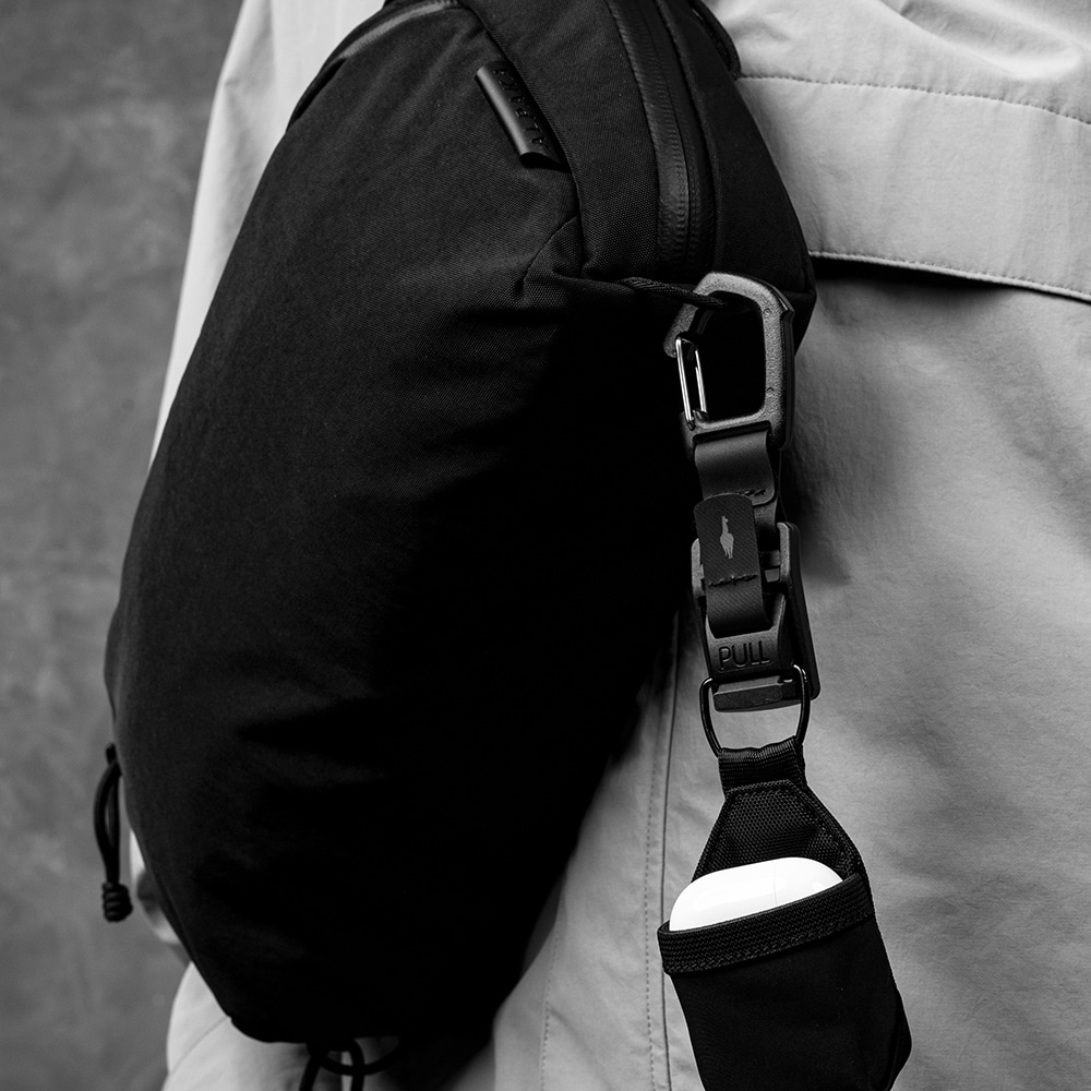 6箇所の取付ループを備えており、別売のカラビナやアクセサリーを装着してお使いいただけます。
