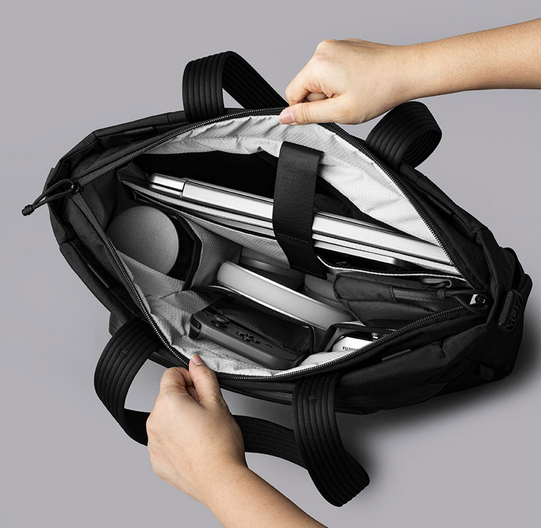 メインコンパートメントには、パッド入りの16インチ対応パソコンスリーブと14インチ対応のタブレットスリーブ、複数のオープンポケット完備なので大容量ながら整理して収納可能です。