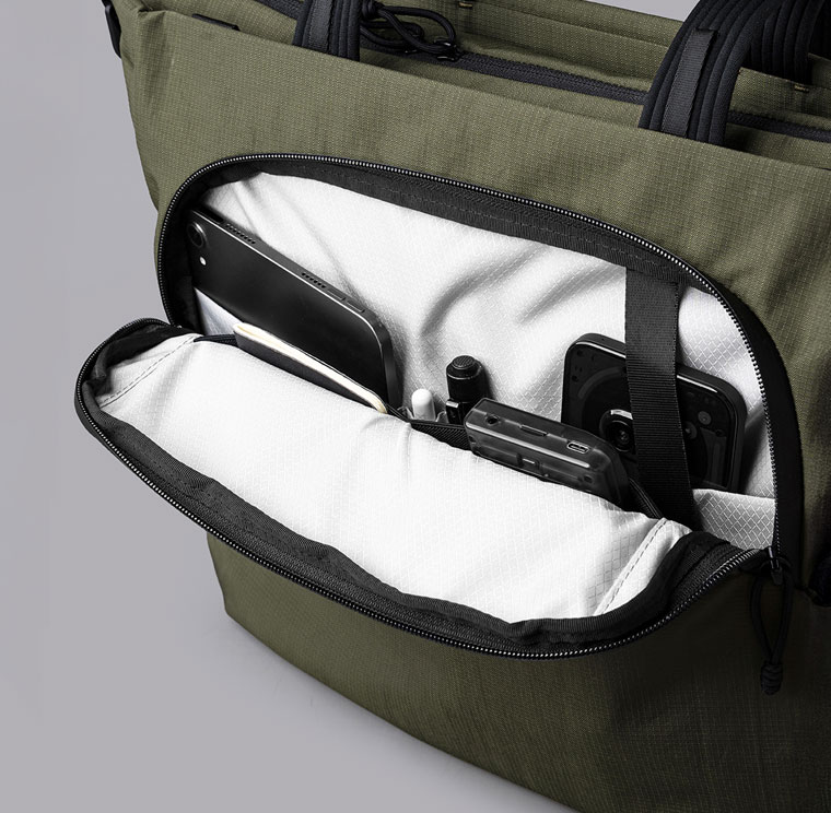 前面のファスナーポケット内には、オープンポケット、ペンホルダー、伸縮性のあるメッシュポケットを配置。