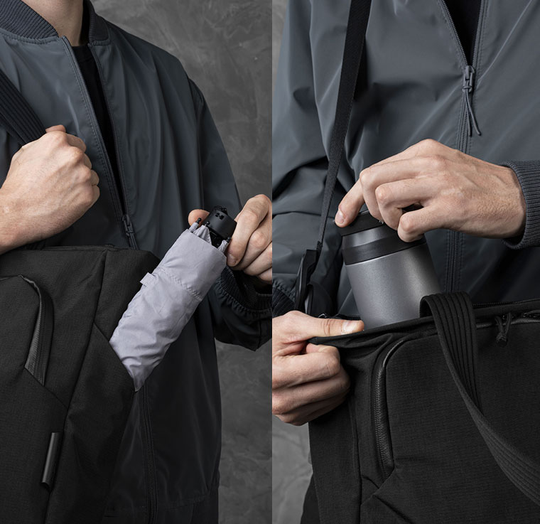 側面には、傘や小型三脚、ウォーターボトルが収納できるボトルポケット付き。
