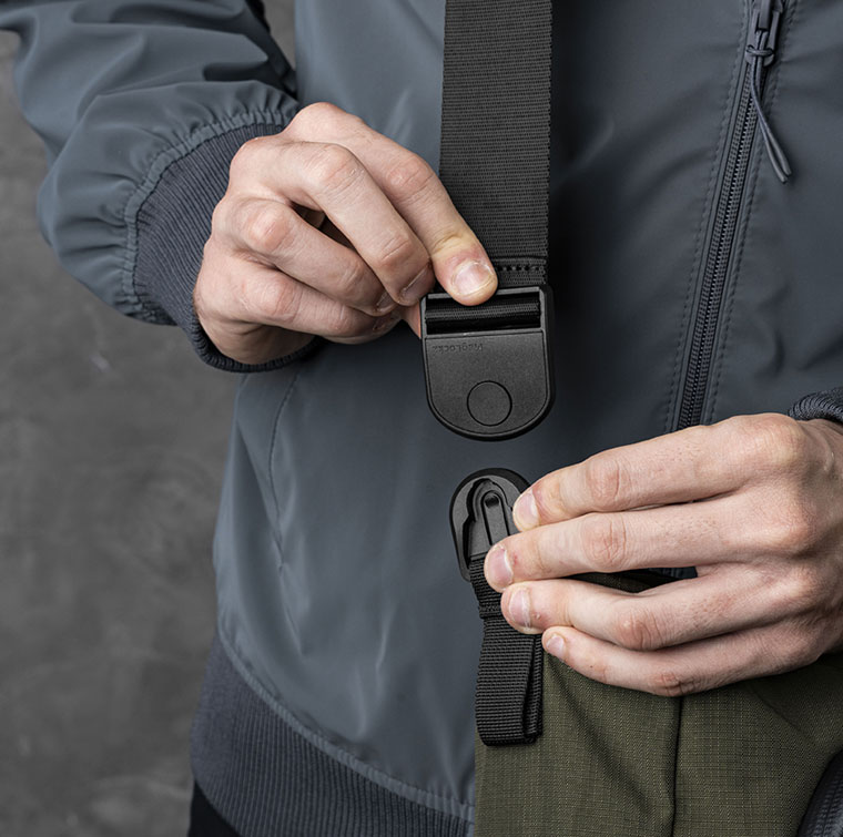 マグロックアタッチメント付きの取り外し可能なショルダーストラップはパッド付きで、 身体への負担を軽減してくれます。