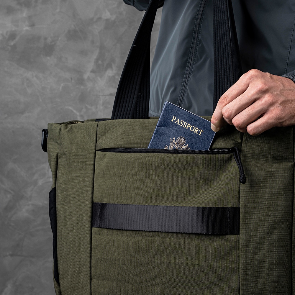 背面には、パスポートなど貴重品の収納に最適なファスナーポケットを備えています。
