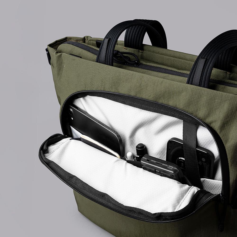 前面のファスナーポケット内には、オープンポケット、ペンホルダー、伸縮性のあるメッシュポケットを配置。