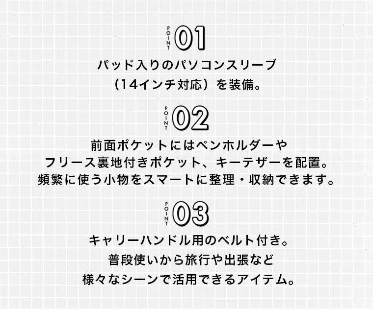 仕様 前面:ファスナーポケット×1(内側にオープンポケットx2、ファスナーポケットx1、ペンホルダーx1、MODキーテザーx1)