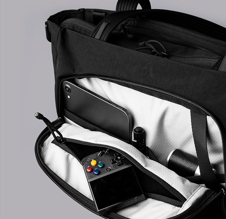 メインコンパートメントには、パッド入りの14インチ対応パソコンスリーブの他、ボトルポケットや複数のオープンポケット完備。大容量ながら整理して収納可能です。