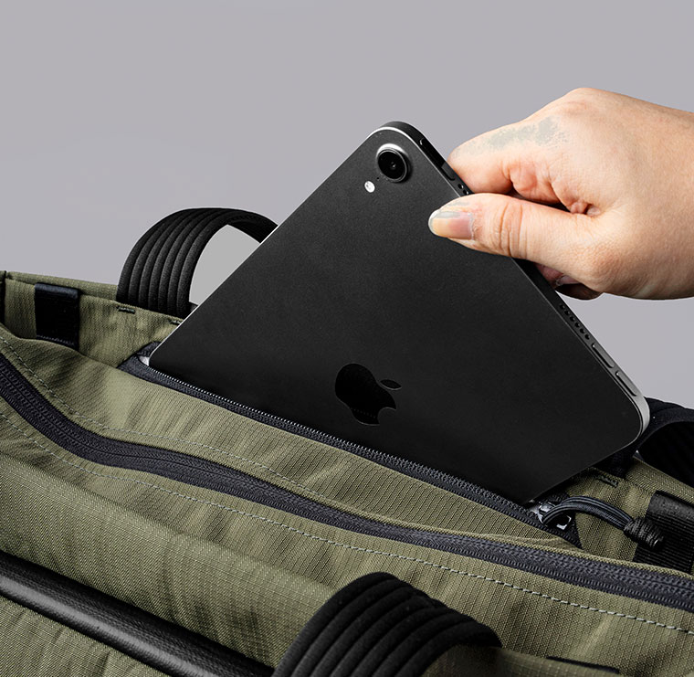 前面のファスナーポケット内には、オープンポケット、ペンホルダー、裏地がフリース素材のファスナーポケットを配置。