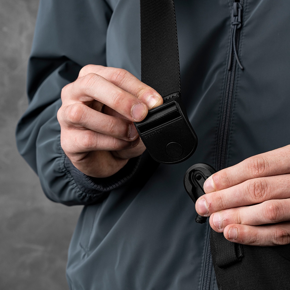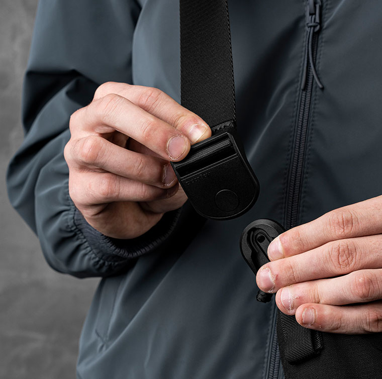 マグロックアタッチメント付きの取り外し可能なショルダーストラップはパッド付きで、 身体への負担を軽減してくれます。