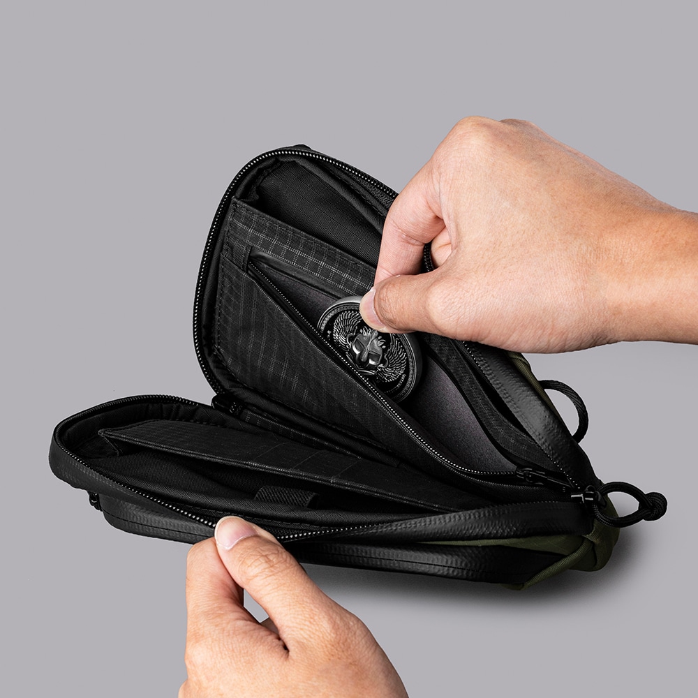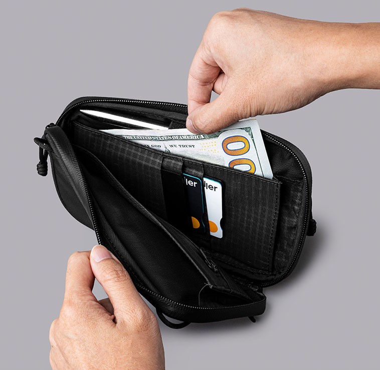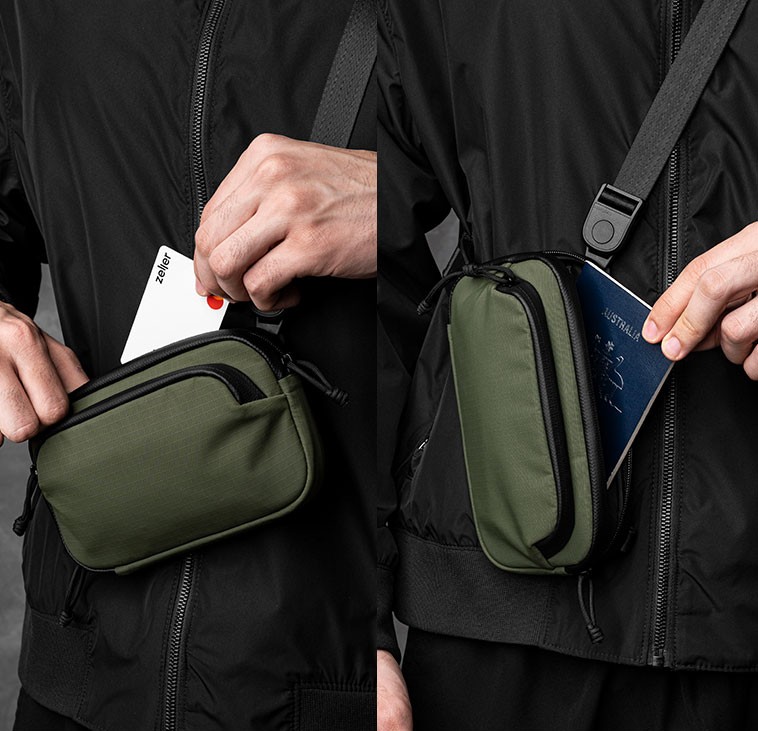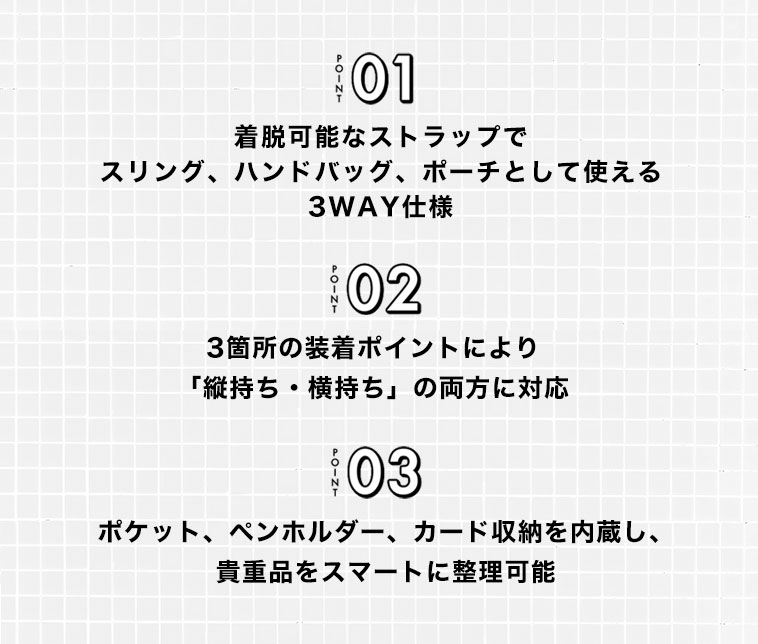 シーンに応じてスリング、ハンドバッグ、ポーチへと姿を変え、日常の外出から旅先のサブバッグまで、スタイルや荷物に合わせて最適な持ち方を選べます。
