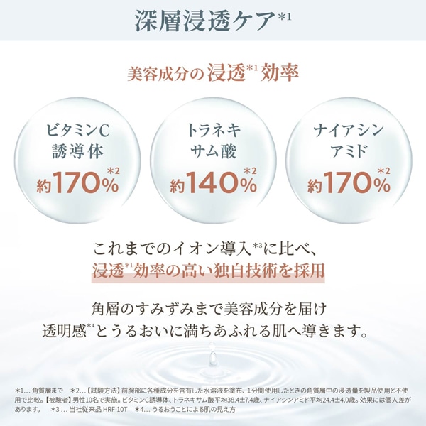 *4……【試験方法】30~50代 女性13名で実施。化粧品のみ、本品+化粧品をそれぞれ半顔に2.5分間使用した後の肌水分量。(化粧品は当社製化粧水を使用)