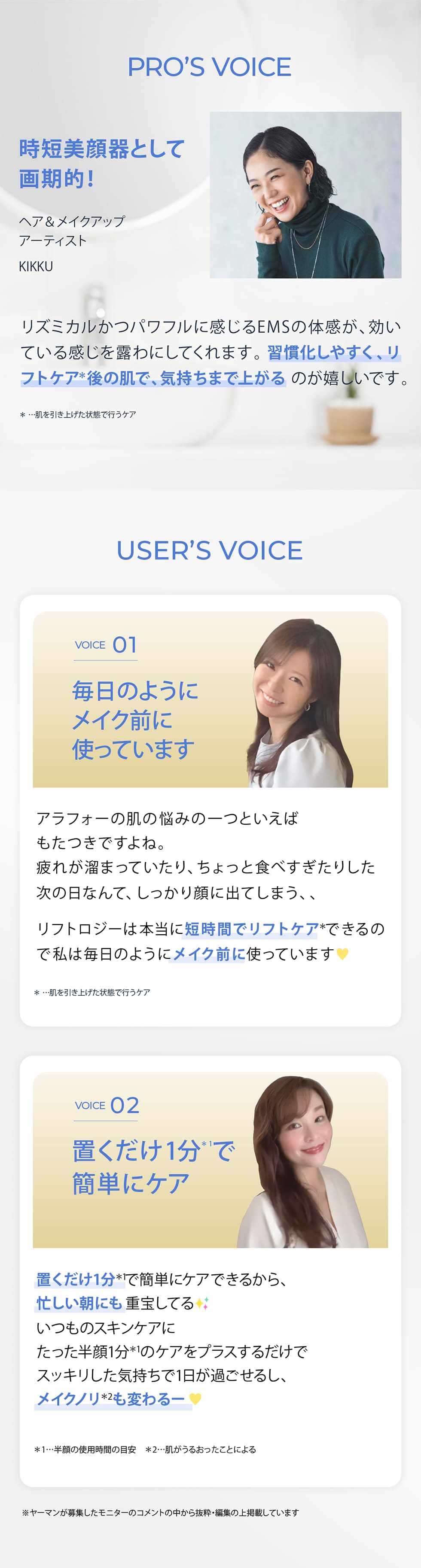 ・医用電気機器を使用している人(ペースメーカーなどの体内植込型医用電気機器、人工心肺などの生命維持用電気機器、心電計などの装着型医用電気機器)・心臓疾患、障害及びその疑いのある人・自分で意思表示できない人・温度や刺激の感覚が自覚できない人・自己免疫疾患のある人・妊娠初期から出産直後までの人(顔への使用は可)