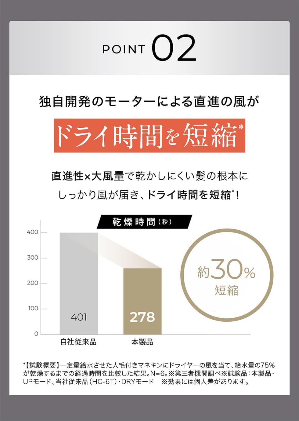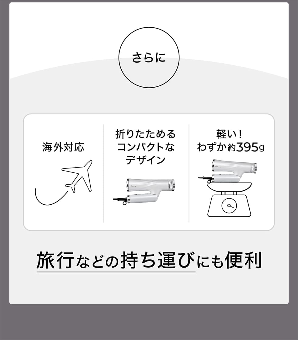 速乾性のある大風量×直進性の風、低温設計、イオンリセットテクノロジーなどの機能はそのままに折りたたみ式で海外にも携帯できるスマートモデル。