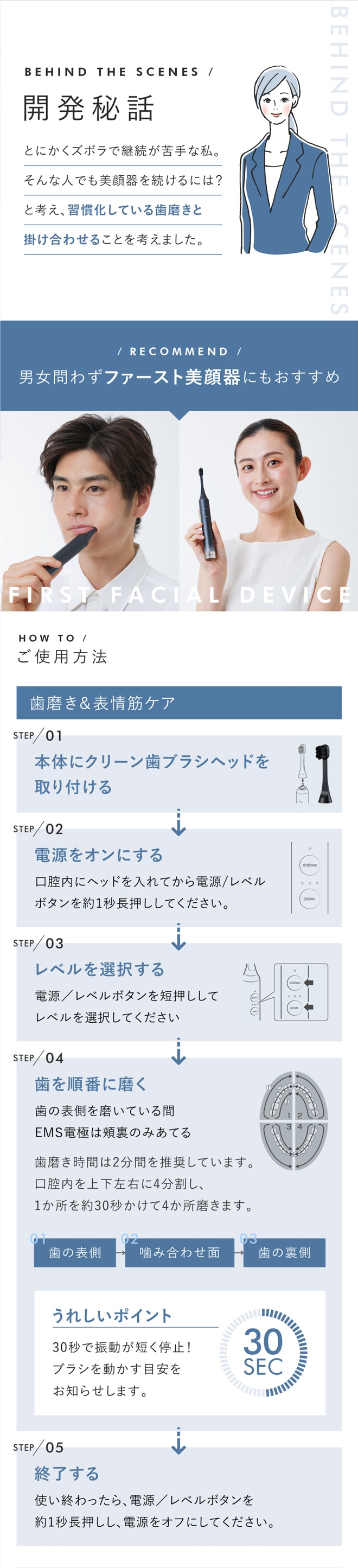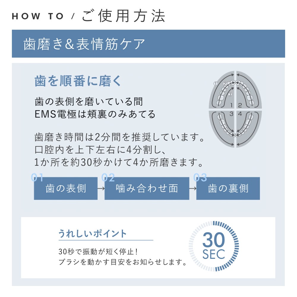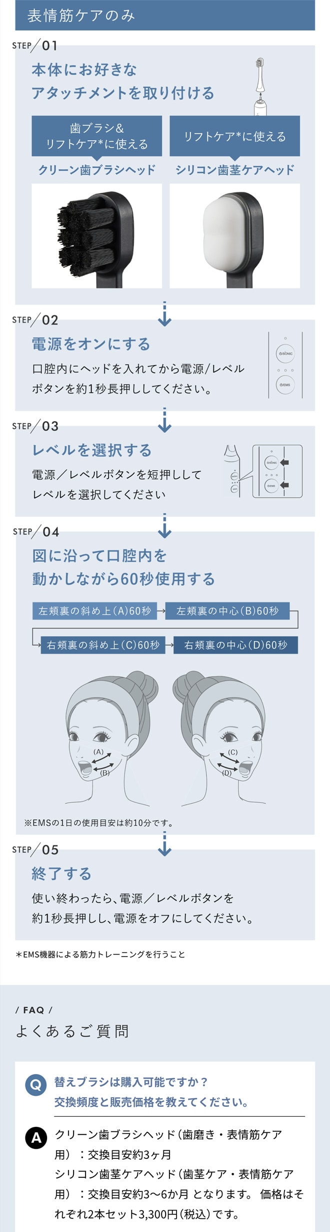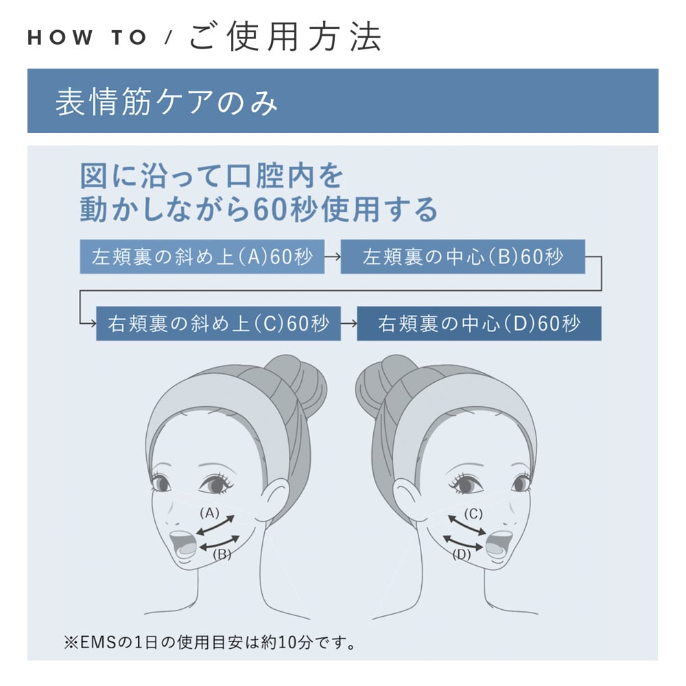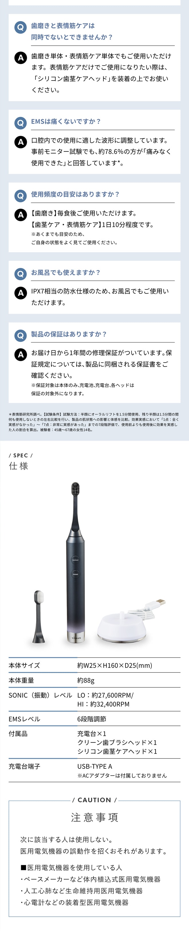 ・口腔内に傷や発疹、炎症等の異常がある場合 ・酒気帯びの場合・頭部・陰部・眼球・顔・まぶた(眼窩)・のど・膨らんだホクロ・ウイルス性のイボ・骨折している部位・唇や舌、歯茎(EMS使用時のみ)・美容医療施術後に内出血や腫れ、かさぶた等のある部位※施術後2週間はご使用を控えていただき、医師にご相談の上問題なければご使用いただけます。(施術例:ヒアルロン酸注入、シリコン注入、ボトックス、糸リフト、二重整形、HIFU等)・外科手術(形成、整形、美容)等で体内に金属を埋め込んだ部位