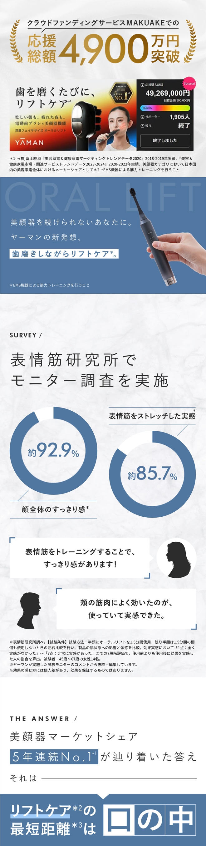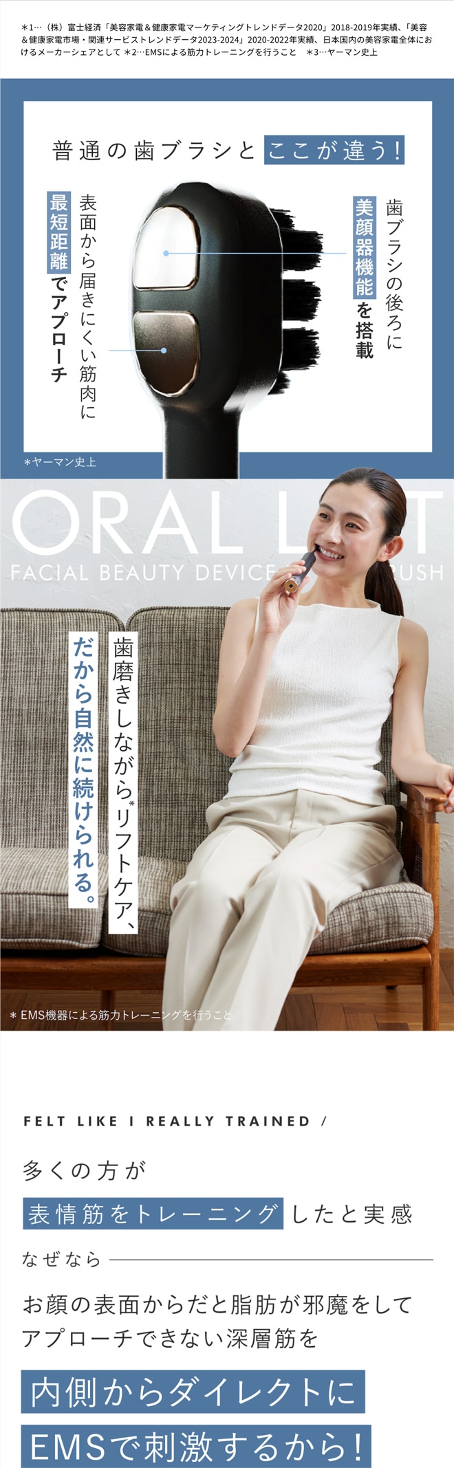※3 表情筋研究所調べ。【試験条件】試験方法:半顔にオーラルリフトを1.5分間使用、残り半顔は1.5分間の間何も使用しないときの左右比較を行い、製品の肌状態への影響と体感を比較。効果実感において「1点:全く実感がなかった」~「7点:非常に実感があった」までの7段階評価で使用前よりも使用後に効果を実感した人の割合を算出。被験者:45歳~67歳の女性14名。