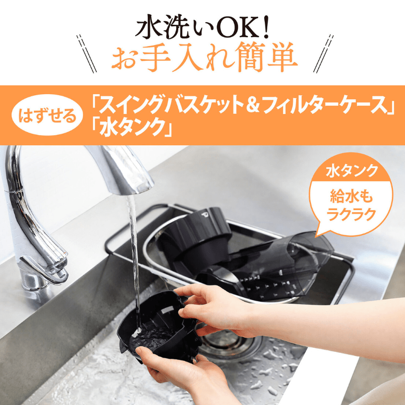 スイングバスケット、フィルターケースがはずせて洗えるのでお手入れ簡単。