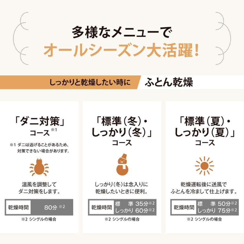 ・「羊毛」「羽毛」「綿」「化学繊維」などのふとんを乾燥※5