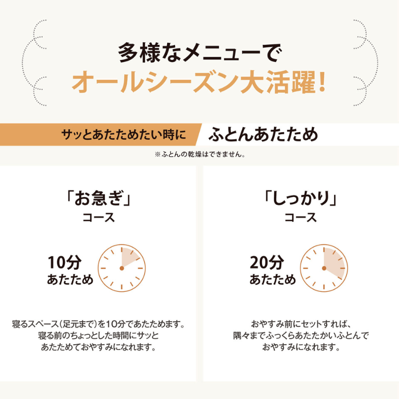 おやすみ前にセットすれば、隅々までふっくらあたたかいふとんでおやすみになれます。