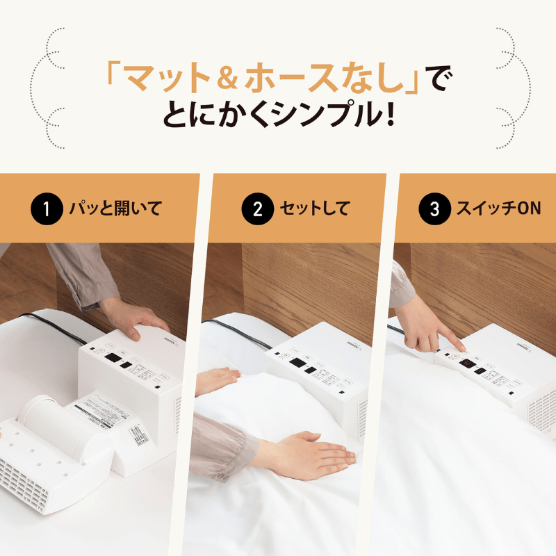 マット&ホースが不要なので、「開く→ふとんをセット→スイッチON」の3ステップで簡単、手軽に使用できます。