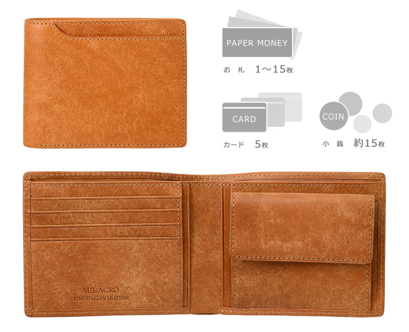 一番使いやすいとされ、贈り物にも選ばれやすい小銭入れ付きの2つ折り財布です。フラップ式の小銭入れは大きく開き、小銭の出し入れに便利。豊富な縦横のオープンポケット5つが領収書やクーポンの収納におすすめで、クレジットカードポケットも必要最低限の枚数が収納できるよう4つ付いています。とてもシンプルで使いやすい財布です。ブランドであるMILAGROのロゴは内側に小さく素押しされています。