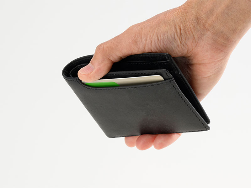 財布の前面にはICカード用のポケットが付いています。鞄から財布をさっと取り出し、財布をかざすだけ。自動改札でそのままタッチ&ゴーでスムーズに入出が可能なほか、タクシーでの支払い、コンビニでの会計などキャッシュレスで重宝します。