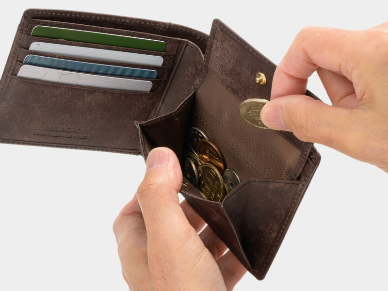 小銭入れはしっかりとマチがあるので、中が見やすく出し入れがしやすい形状です。必要な小銭をサッと取り出せるから、レジ前でももたつきません。しっかりフタがあることで、小銭の飛び出しや落下防止になり安心です。