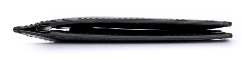 薄型に作られた意匠登録デザインの財布。2枚の革を合わせたカスタネットのような作りがユニーク!