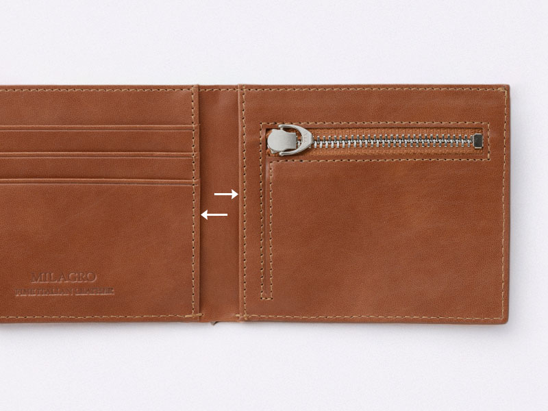 また、札入れ部分はあえて仕切りを設けず、シンプルな構造に仕上げています。これにより、無駄な厚みを削ぎ落とし、ポケットに入れてもかさばらないスリムなフォルムを実現。紙幣の出し入れもスムーズで、スマートな所作を演出します。薄さと使いやすさ、その両立を叶えるためのこだわりです。
