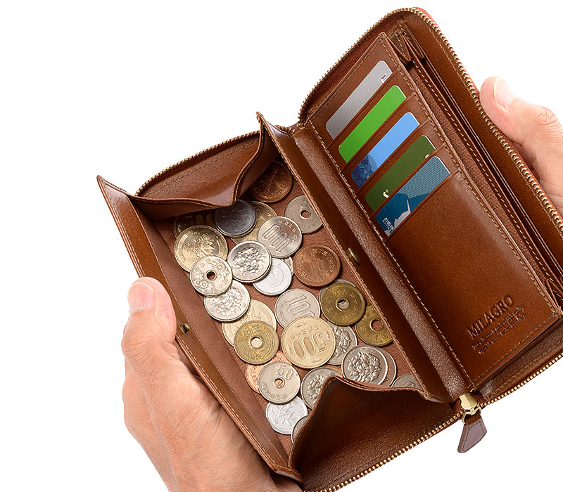 大きく、見やすく開く大容量の箱型小銭入れと、 安心設計のラウンドファスナーが特長