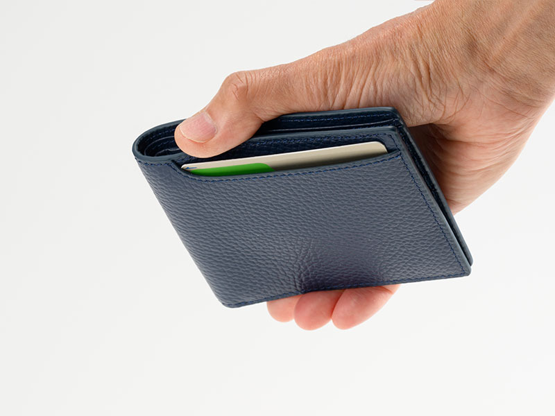 財布の前面にはICカード用のポケットが付いています。鞄から財布をさっと取り出し、財布をかざすだけ。自動改札でそのままタッチ&ゴーでスムーズに入出が可能なほか、タクシーでの支払い、コンビニでの会計などキャッシュレスで重宝します。