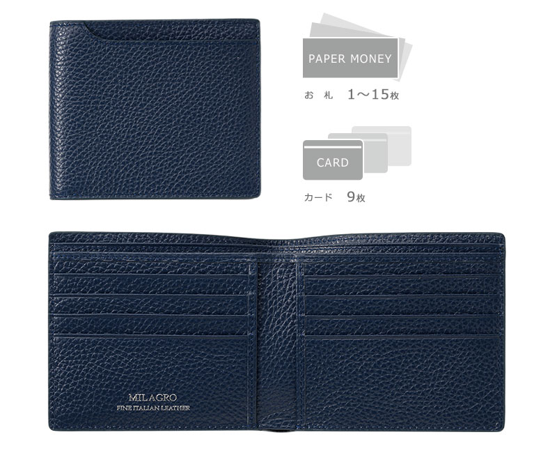 前面にレイアウトされたICカードポケットは改札時にタッチ&ゴーでスムーズに通り抜け出来て便利です。そのほか、内側に左右4つの計8つのカードポケットが付いています。札入れは仕切りつきなので札の種類を分けて収納できて便利です。また、内側に使い勝手の自由なオープンポケットが2つ付いています。小銭入れがないぶん薄型で、キャッシュレス財布としておすすめです。ブランドであるMILAGROのロゴは内側にシルバー色で箔押しされています。