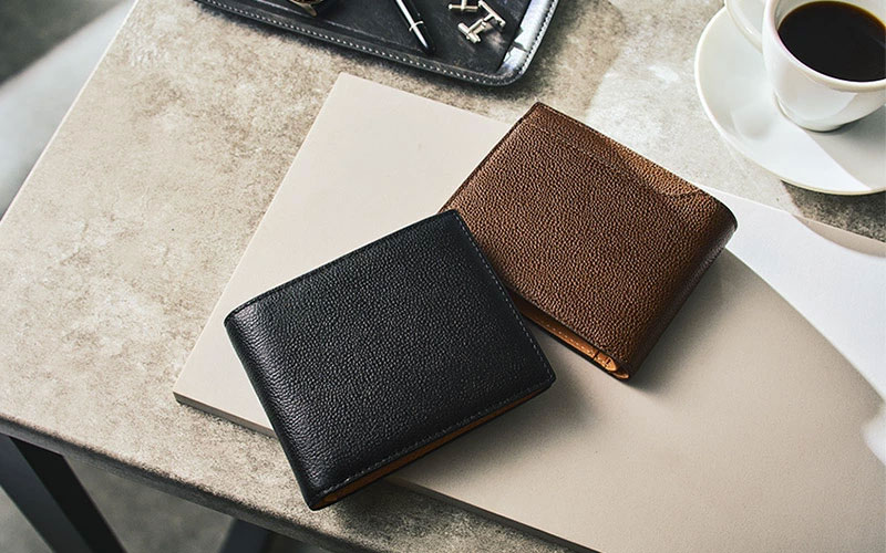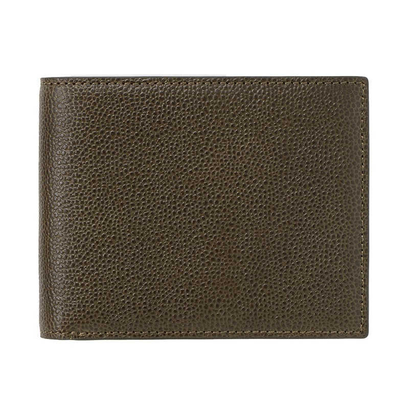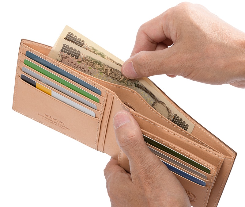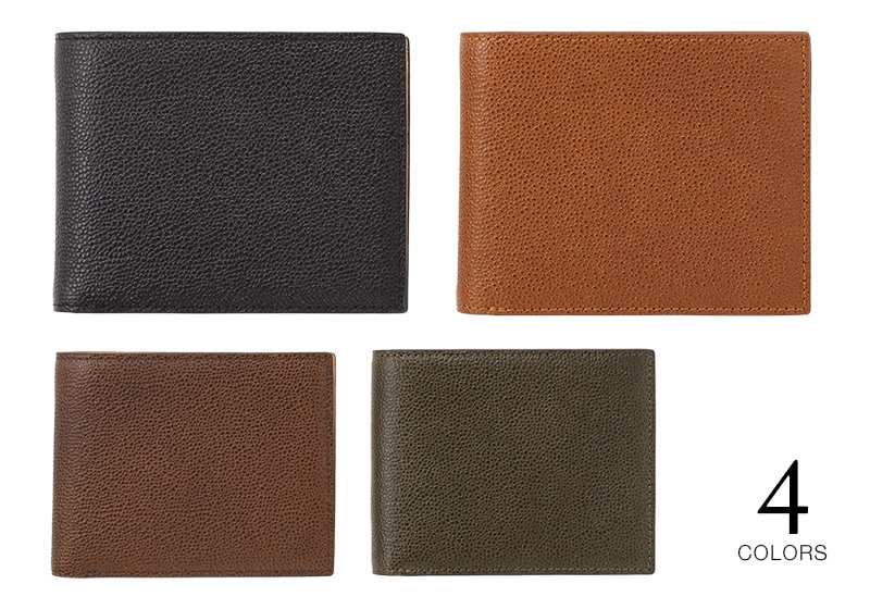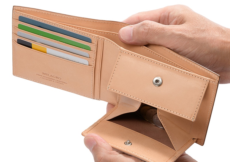 使いやすさを重視した定番の二つ折財布。大きく開く小銭入れ付き。