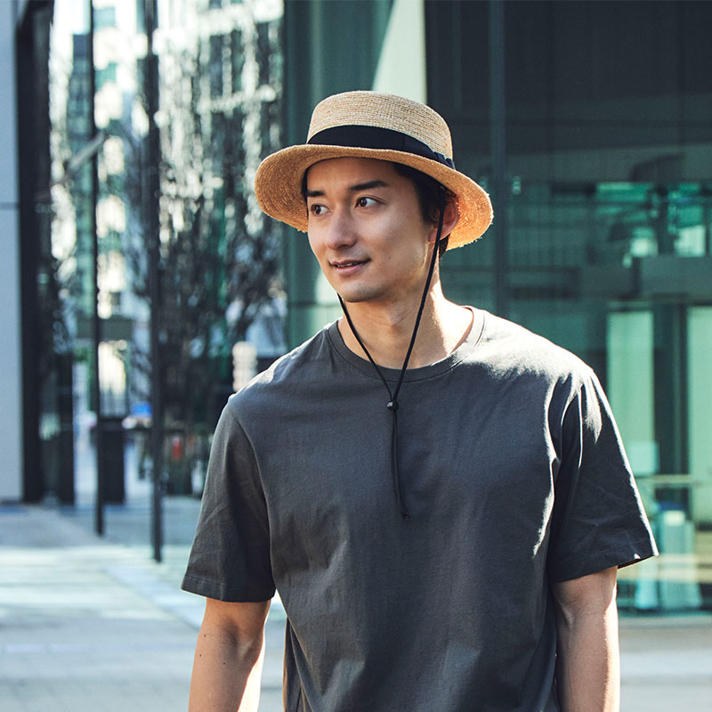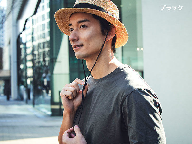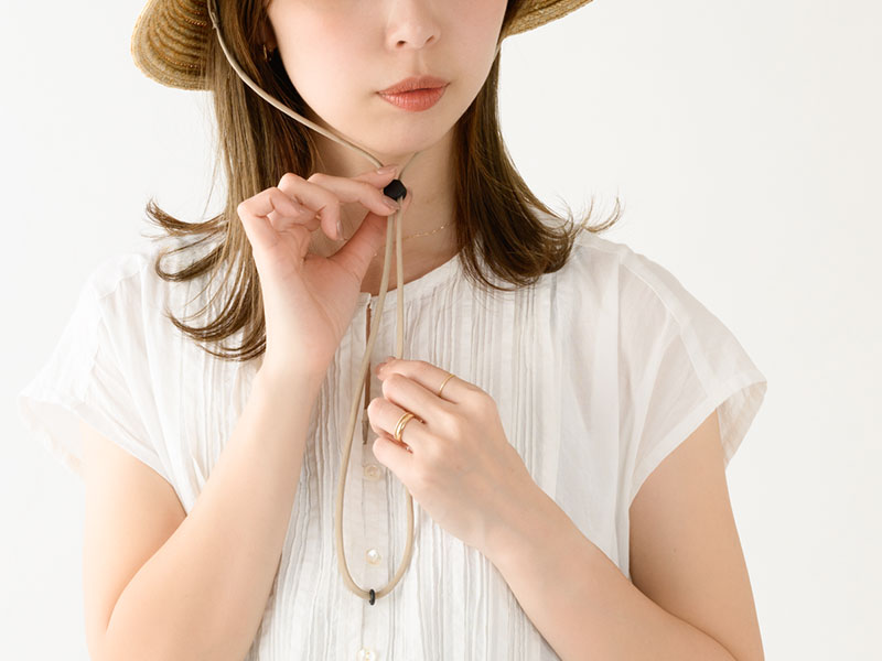 帽子についている付属のループに簡単に装着が出来るストラップ(あご紐)です。紐自体はふんわりとした伸縮性のある素材で、締めたときに食い込んでも痛くありません。 しっかりケアされた使い勝手の良いストラップです。