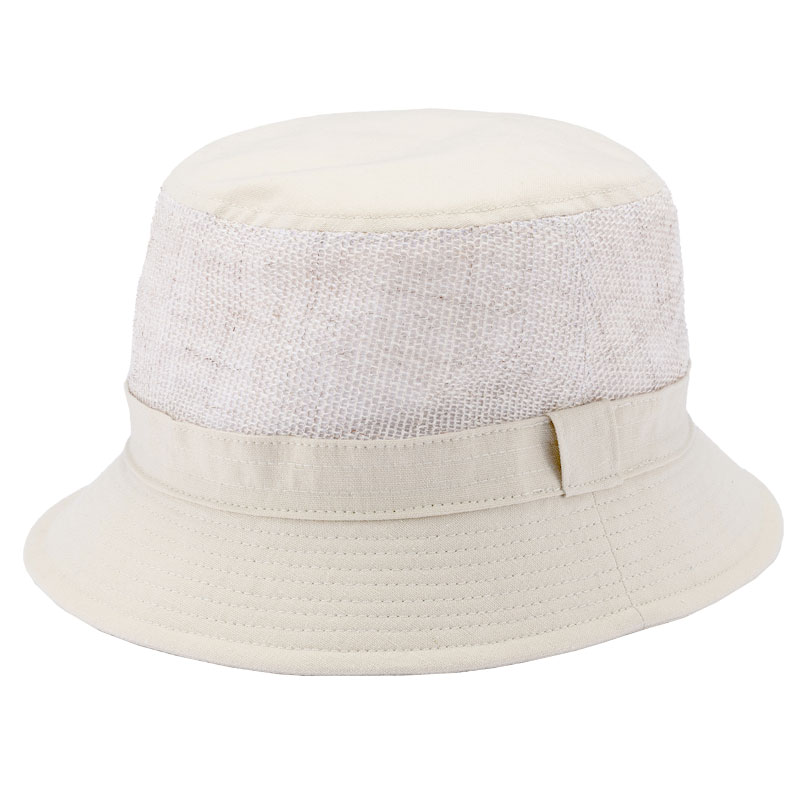天然素材の麻ハットは、頭部横部分に軽さと涼しさが特長の「尾州からみ織り」を使用し、頭頂部とつば部分に綿麻を使っています。綿麻をつかうことでしっかりと日除けができます。異なる素材はいづれも天然素材で相性が良く、紳士の夏のハットとしておすすめです。