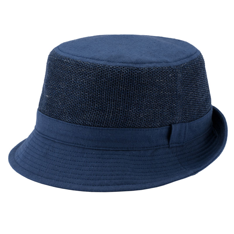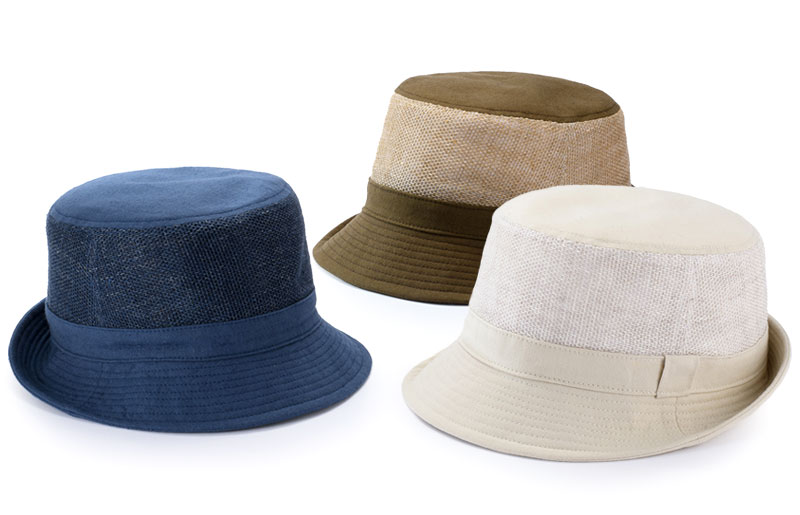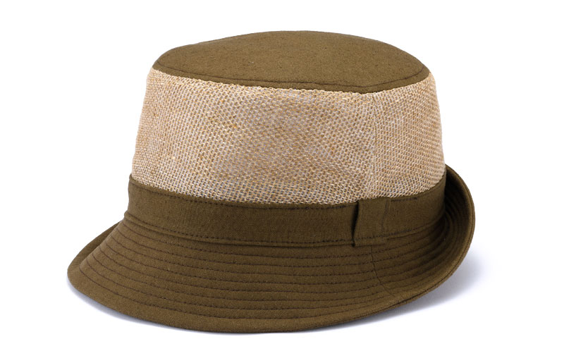 天然素材の麻ハットは、頭部横部分に軽さと涼しさが特長の「尾州からみ織り」を使用し、頭頂部とつば部分に綿麻を使っています。綿麻をつかうことでしっかりと日除けができます。異なる素材はいづれも天然素材で相性が良く、紳士の夏のハットとしておすすめです。