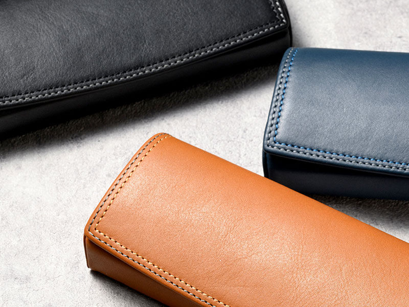 本シリーズはブラック、ネイビー、ライトブラウンの3色展開で、各々カラーの異なる2重のステッチで縫製しています。2つのラインは美しく一定の間隔で縫製されており、シンプルな作りに彩りを与えてデザインのアクセントになっています。