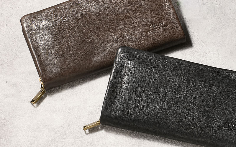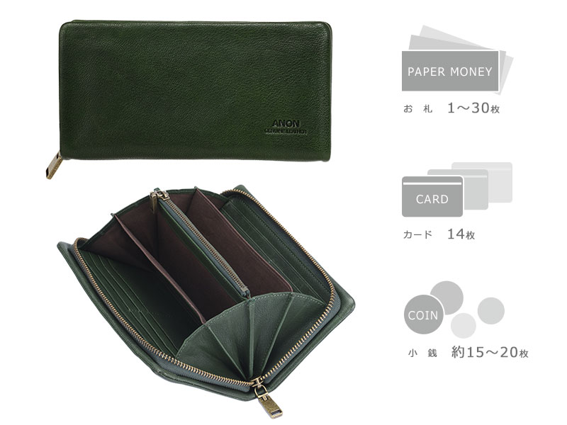 最大の特長は、扇状に大きく開く蛇腹構造の収納部とカードポケット13個、背面のICカード用ポケットなど収納力抜群で多機能な点です。また、柔かく、コシのある山羊革(ゴートレザー)による袋縫いも大きな特長です。