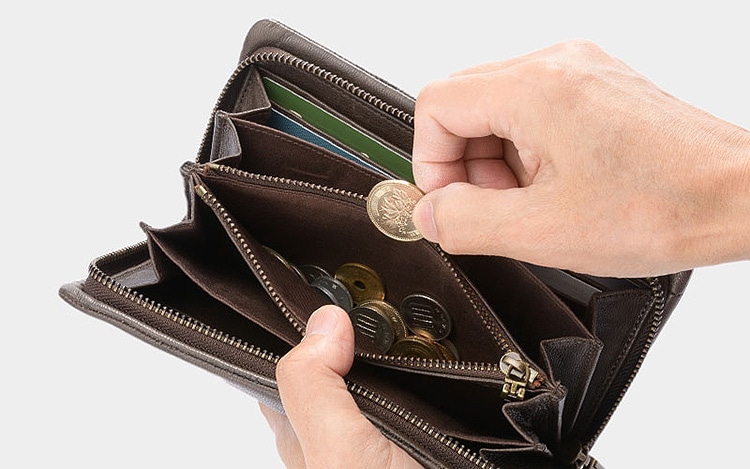 また、中央部の仕切りはファスナー式の小銭入れになっています。