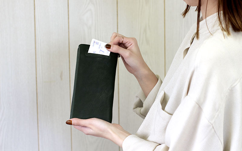 鞄から財布をさっと取り出し、財布をかざすだけ。自動改札でそのままタッチ&ゴーでスムーズに入出が可能なほか、タクシーでの支払い、コンビニでの会計などキャッシュレスで重宝します。スキャンで取り出しが必要ないため、すっぽり収まる設計の作りになっています。