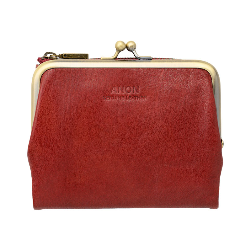 素材は、山羊革(ゴートレザー)を使用しています。牛革と比べ革表面の表情が豊かで、傷が付きにくく丈夫な革です。使っていくうちに柔らかくなり、また光沢感が増していく経年変化に富んだ革で、男女兼用で使用可能です。がま口の金具の色はアンティックゴールドで、クラシカルな雰囲気を演出します。ダーク系の定番の2色のほか、明るめのライトブラウンとレッドをご用意しています。