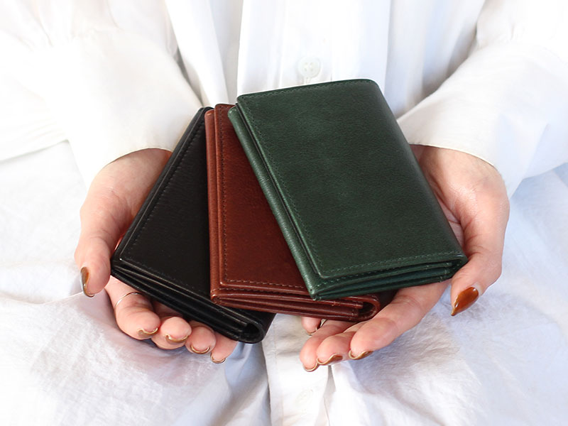 素材は牛革を使用。柔らかさとシワ感を出すためにミリング加工を施しました。90%植物性タンニンなめしされた半ヌメの牛革です。上品な仕上がりで、ブラック、ダークブラウン、グリーンの3色をご用意しました。